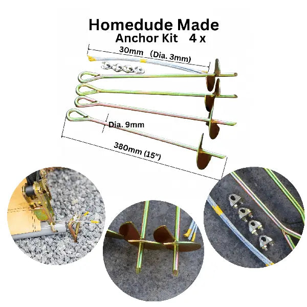 - Anchors: Ground stakes & shackle/anchor kit included.
